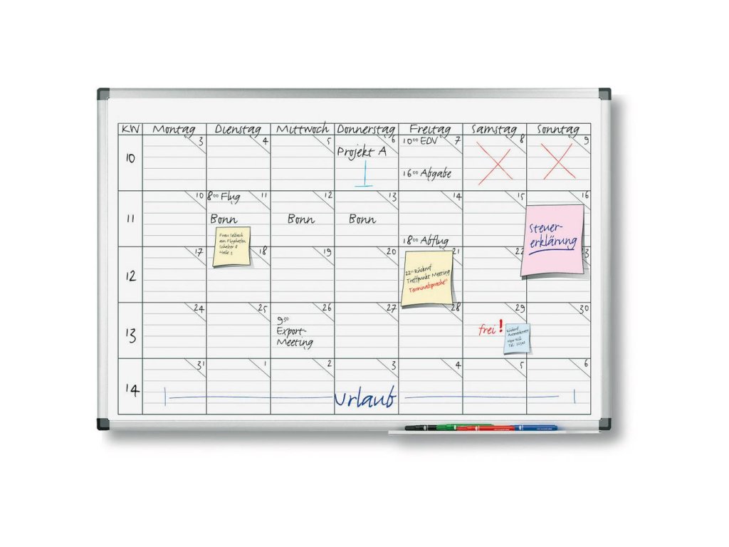 Tabuľa s popisovateľným magnetickým a špeciálne lakovaným a UV tvrdeným povrchom vo verzii týždňového plánovača pre 5 ľudí/ projektov alebo pre jedného človeka na obdobie 5 týždňov. Veľký priestor pre informáciu. Rozmery denného okna 110 × 120 mm. Magnetický popisovateľný povrch. Sada príslušenstva zahrňuje 4 stierateľné popisovače TZ 111 a 8 okrúhlych magnetov priemeru 25 mm.