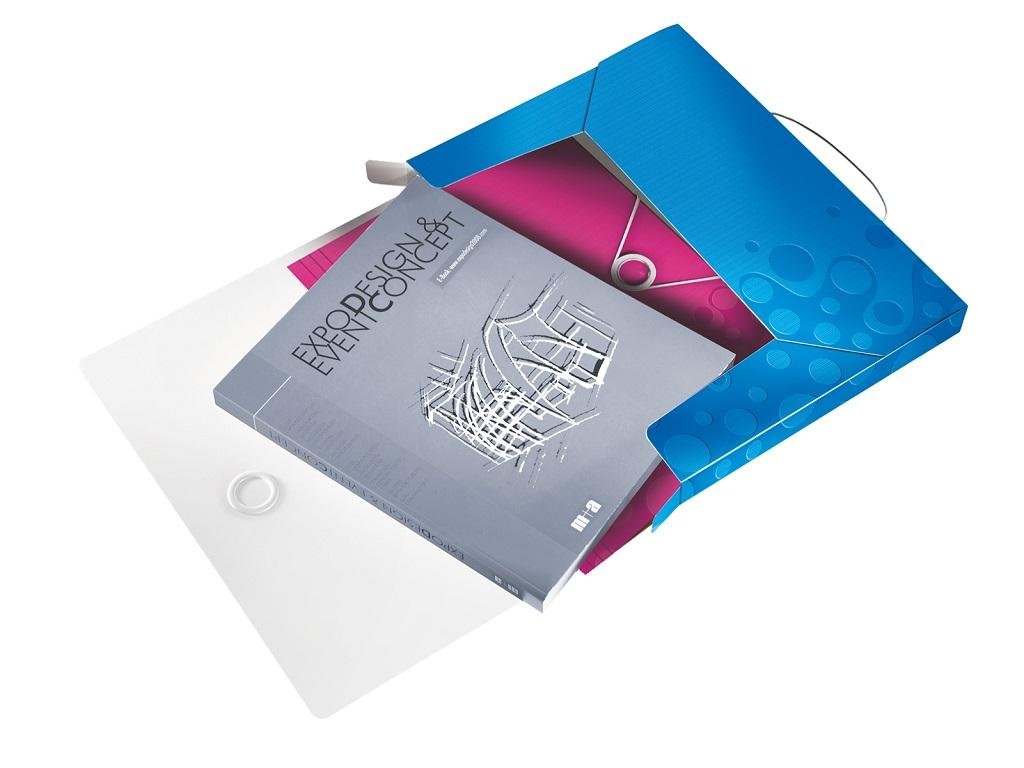 Nepriehľadný polypropylénový box na prenos objemnejších spisov, cenníkov, katalógov a pod. do formátu A4. V dizajne rady WOW v žiarivých farbách. Praktické zatváranie gumičkou na kovový krúžok. Rozmery (v × h × š) 330 × 250 × 37 mm. Väčšie balenie 5 ks. Farba metalická modrá.
