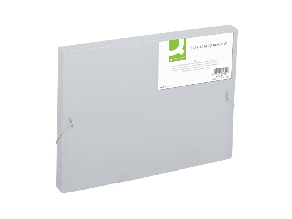 Transparentný plastový box s tromi chlopňami vyrobený z polypropylénu, uzatvárateľný gumičkou. Kapacita 250 listov, šírka chrbta 25 mm. Farba mliečna.