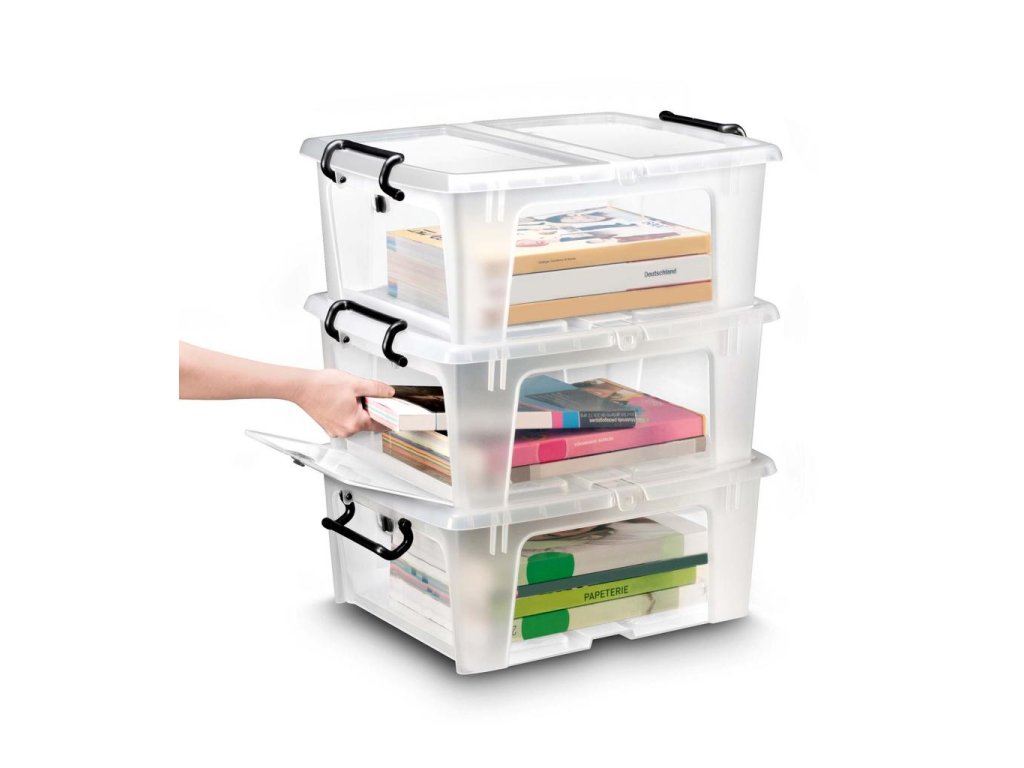 Transparentný robustný multifunkčný box z plastu s vekom, stohovateľný pri nepoužívaní. Motýlie veko na otváranie z 2 strán z dôvodu ľahšieho prístupu, 2 pevné rukoväte slúžiace na prenos boxu a súčasne ako klip na pevné uzatvorenie boxu, otváranie boxu spredu. Materiál recyklovaný PP. Objem 20 litrov, romery 46 × 36 × 19 cm. Na tento produkt platí predĺžená záruka 5 rokov.