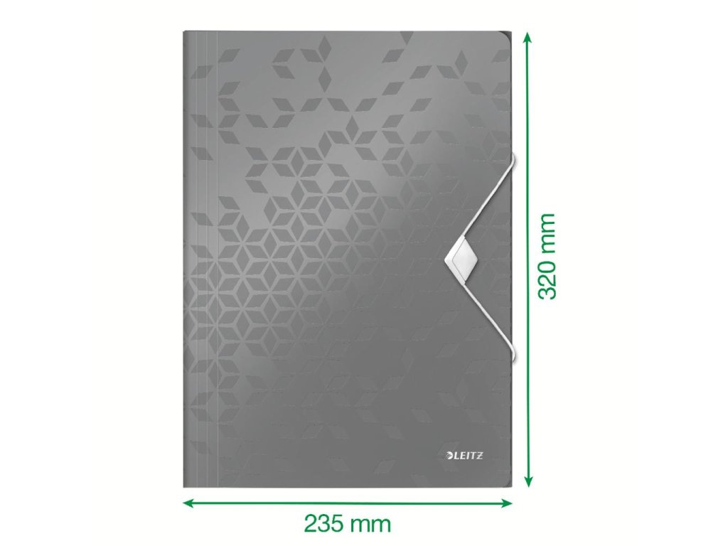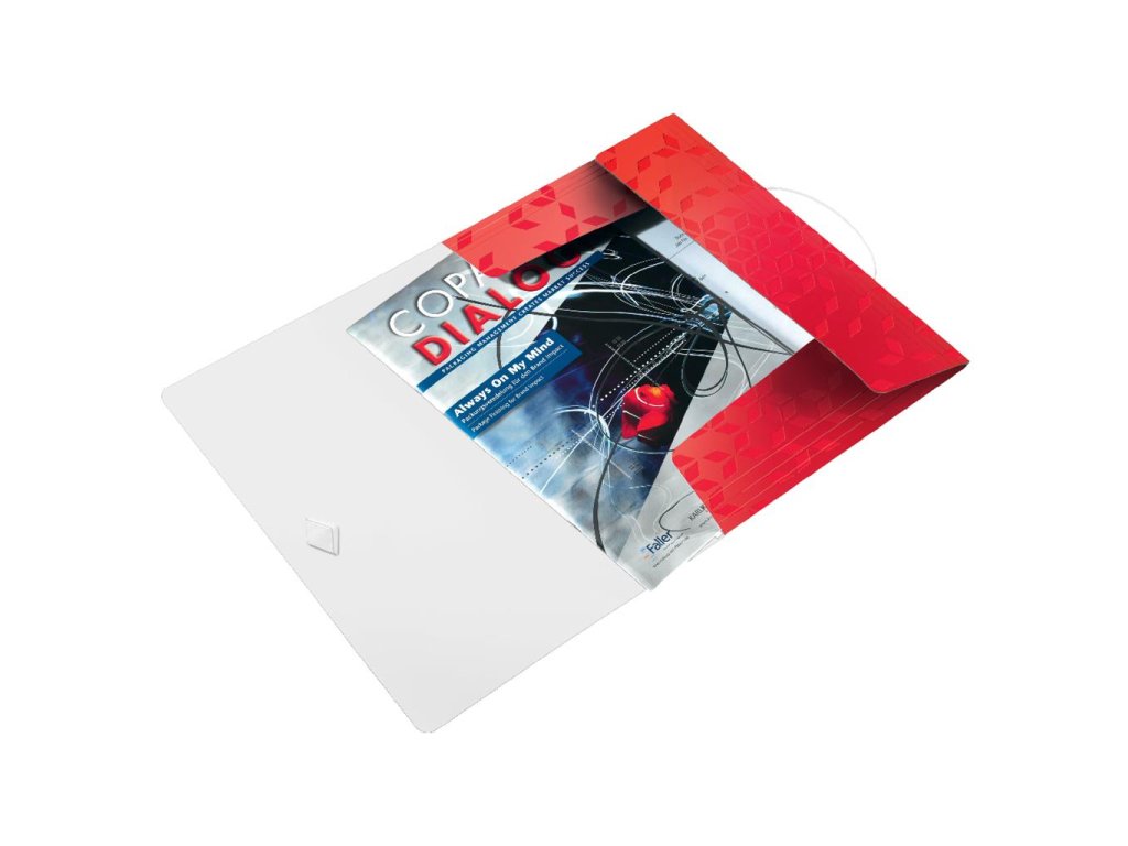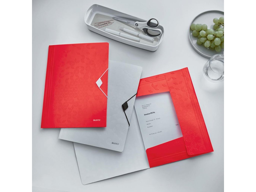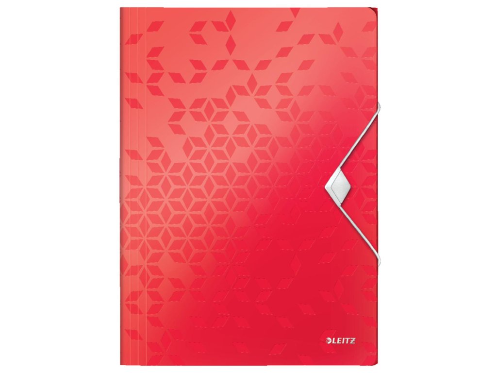 Trojchlopňový obal na dokumenty do formátu A4 z polypropylénu s dlhou životnosťou. V dizajne rady WOW v žiarivej farbe. Uzatváranie uchytením na gumičku. Kapacita 150 listov. Väčšie balenie 10 ks. Farba červená.