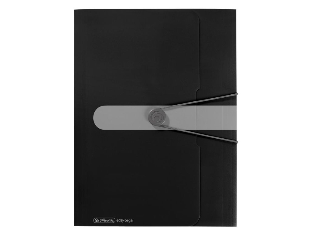 Kvalitný trojchlopňový plastový obal A4 Easy Orga. Materiál polypropylén. Kapacita 300 listov, zatváranie gumičkou o plastový krúžok. Farba transparentná - čierna.