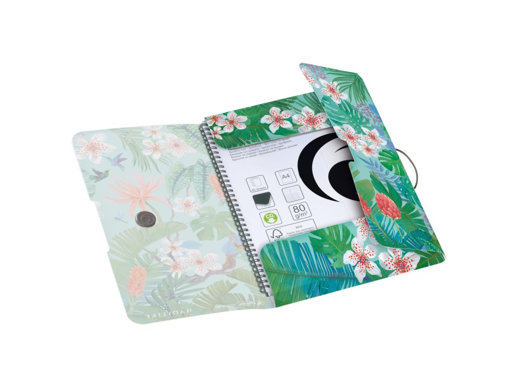 Plastový obal A4, tri chlopne, uzatváranie s gumičkou na plastový krúžok, polypropylén. Kapacita 300 listov, výška plnenia 3 cm. Motív Jungle.