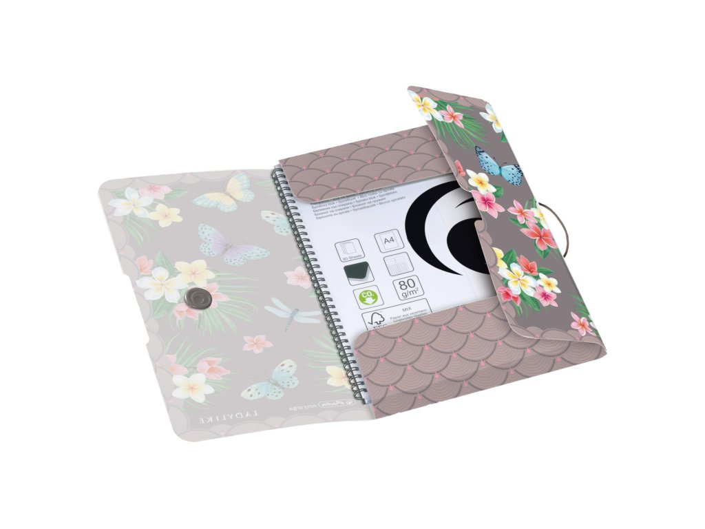 Plastový obal A4, tri chlopne, uzatváranie s gumičkou na plastový krúžok, polypropylén. Kapacita 300 listov, výška plnenia 3 cm. Motív Motýľ.