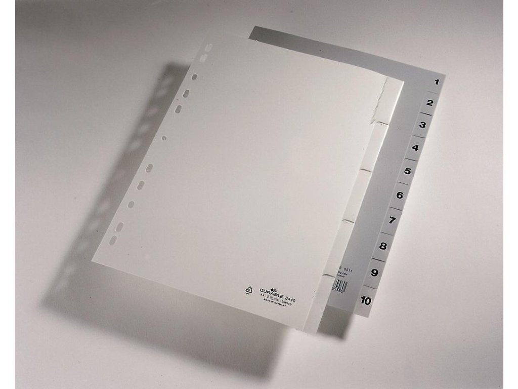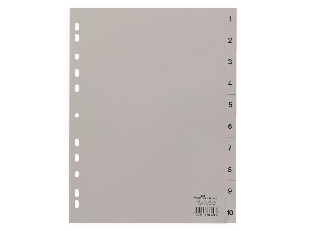 Číselný rozraďovač z polypropylénu. Formát A4, euro-dierovanie. Balenie jedna sada v polyesterovom sáčku. Väčšie balenie 25 sád. Farba sivá.