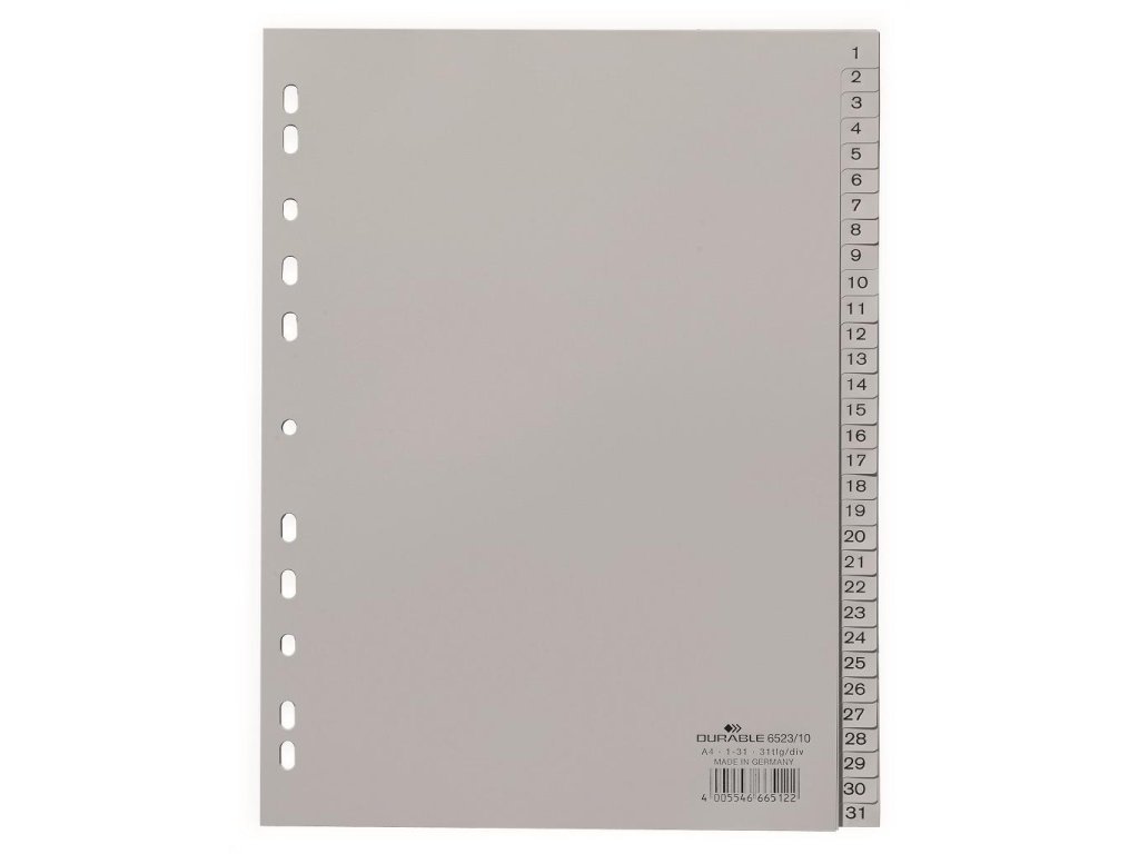 Číselný rozraďovač z polypropylénu. Formát A4, euro-dierovanie. Balenie jedna sada v polyesterovom sáčku. Väčšie balenie 10 sád. Farba sivá.
