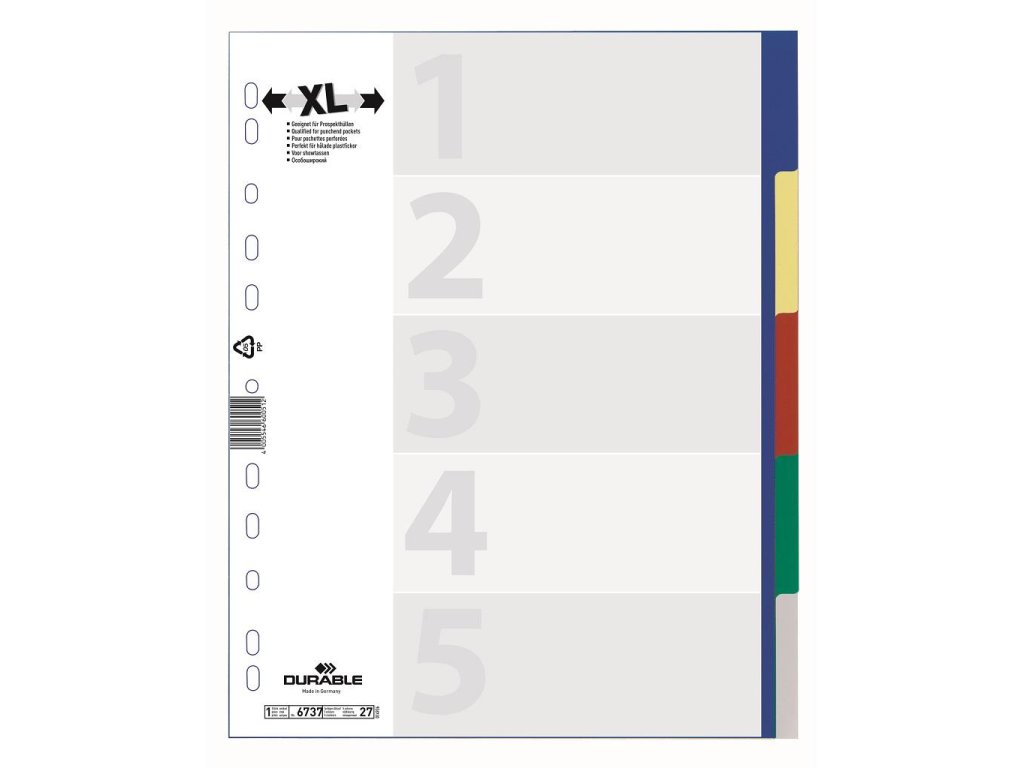 Farebný rozraďovač s 5 oddielmi vyrobený zo zosilneného plastu. Formát A4 maxi, eurodierovanie, popisovateľný papierový titulný list na ľahkú orientáciu v dokumentoch. Výsledný dokument pôsobí upravene a reprezentatívne. Väčšie balenie 20 sád.