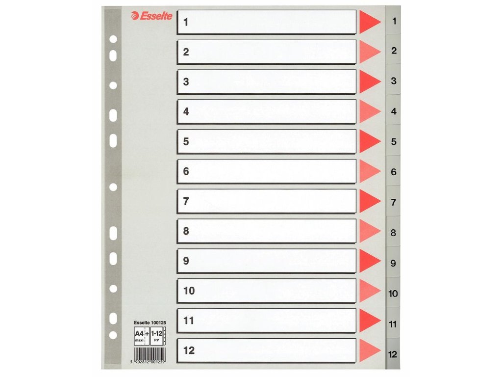 Číselný rozraďovač z polypropylénu. Eurodierovanie, popisovateľný kartónový titulný list na ľahkú orientáciu v dokumentoch. Formát A4 maxi rozmerov 245×297 mm umožňuje rozlíšenie dokumentov založených v zakladacích obaloch. Balenie jedna sada v polyesterovom sáčku. Väčšie balenie 10 sád. Farba sivá.