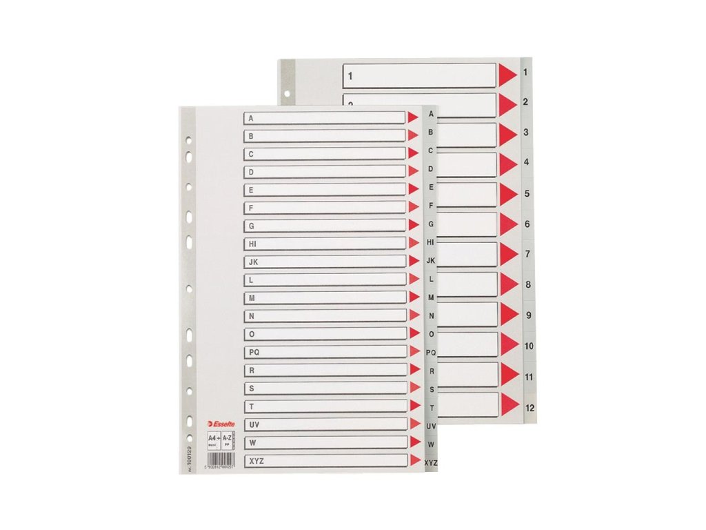 Abecedný rozraďovač z polypropylénu. Eurodierovanie, popisovateľný kartónový titulný list na ľahkú orientáciu v dokumentoch. Formát A4 maxi rozmerov 245×297 mm umožňuje rozlíšenie dokumentov založených v zakladacích obaloch. Balenie jedna sada v polyesterovom sáčku. Väčšie balenie 10 sád. Farba sivá.