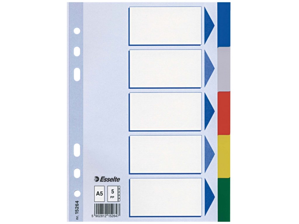 5-dielny plastový farebný rozraďovač. Euro-dierovanie, titulný popisovateľný list. Formát A5. Balenie jedna sada v polyesterovom sáčku. V kartóne 20 sád.