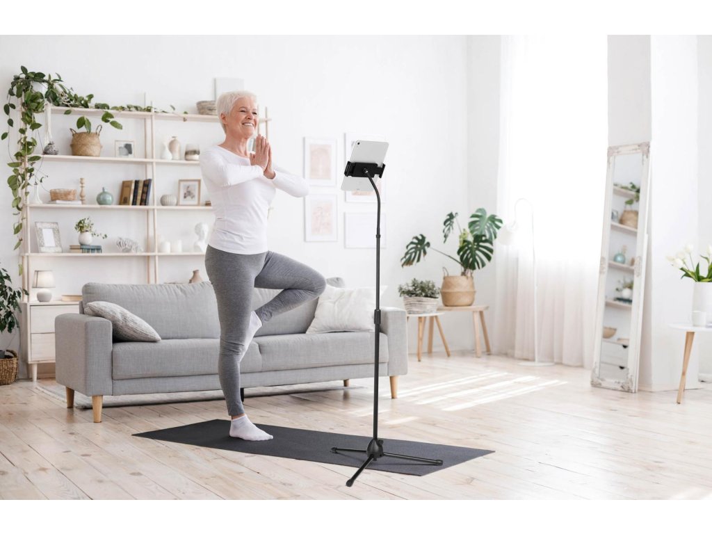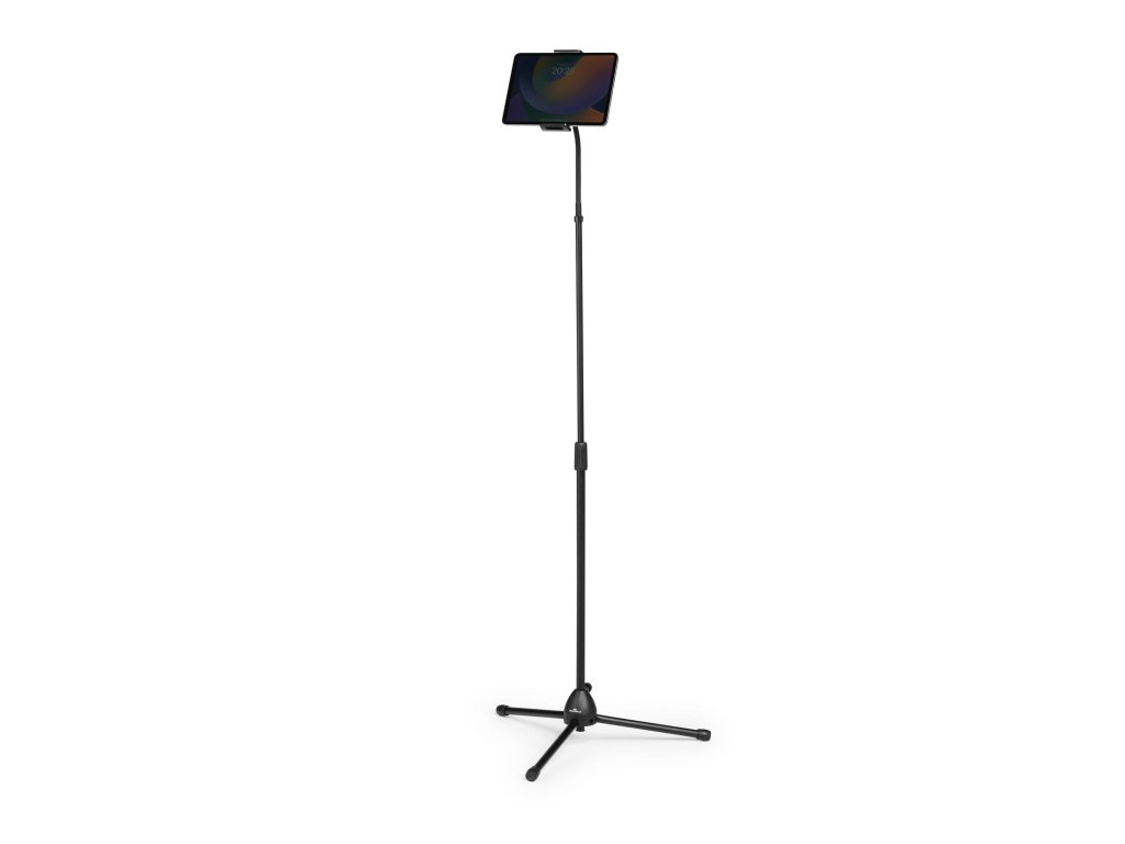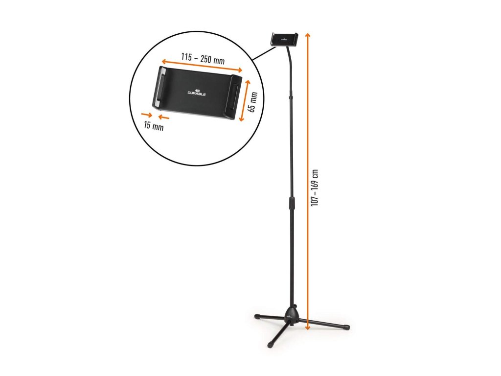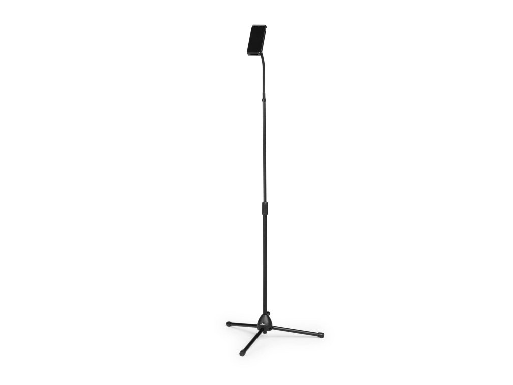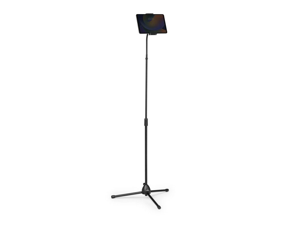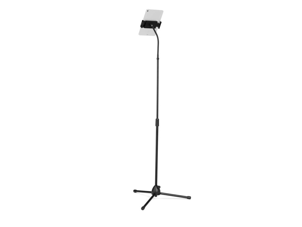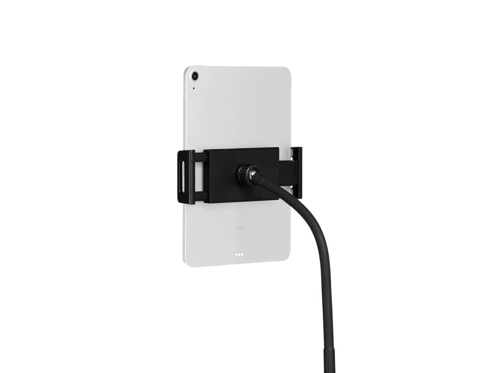 Podlahový stojan s držiakom na tablet a mobilný telefón, vybavený flexibilným ramenom a guľovým kĺbom