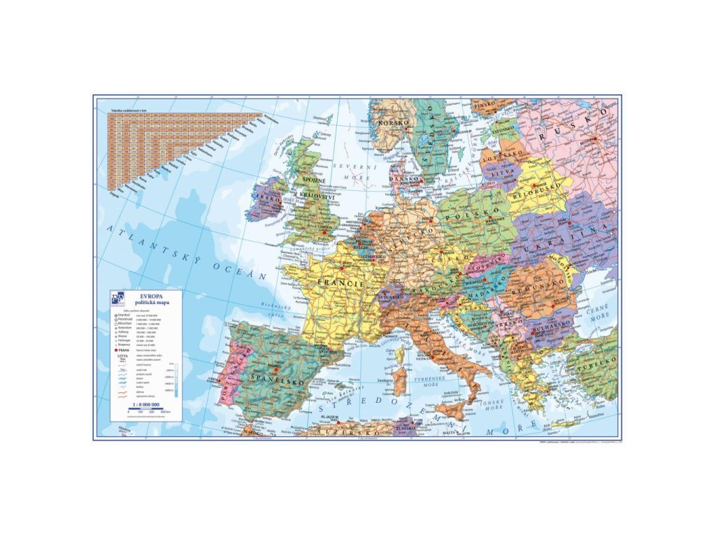 Mapa Európy pod zataveným transparentným obalom z PVC fólie. Postranné klopy na založenie odkazov a poznámok. Text v českej verzii.