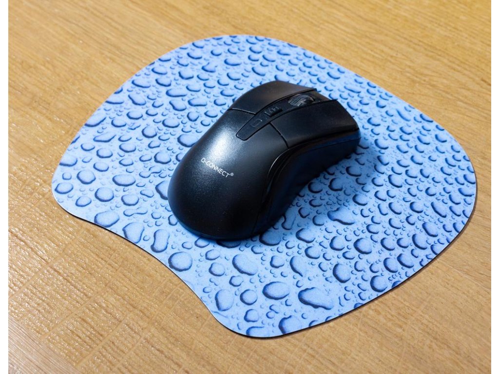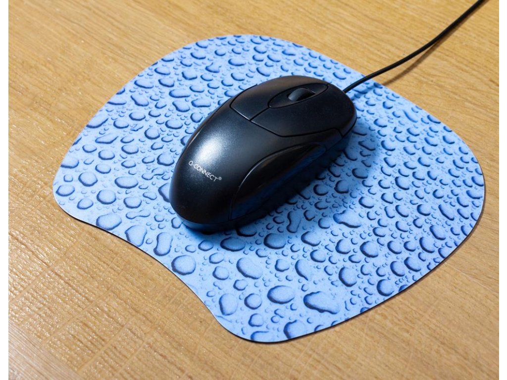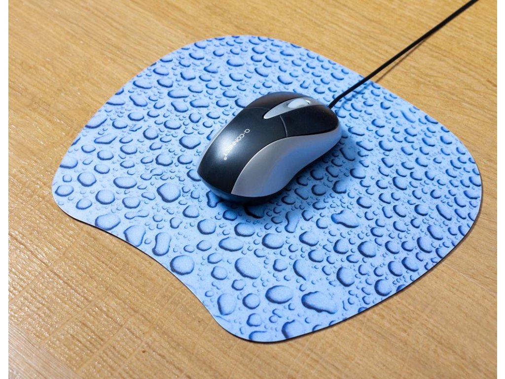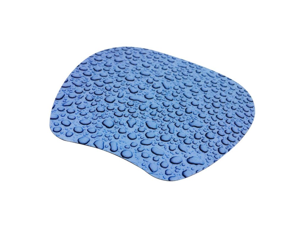 Podložka pod myš iba 1 mm hrubá. Vhodná pre optické myši. Rozmery 212 × 1 × 172 mm. Motív kvapka vody.