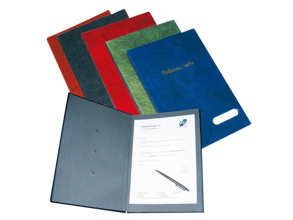 Podpisová kniha 14-dielna s okienkom na prednej strane na jednoduchú výmenu popisovateľného štitka, rozťahovateľný chrbát pre zvýšenie kapacity. Úprava v imitácii kože.