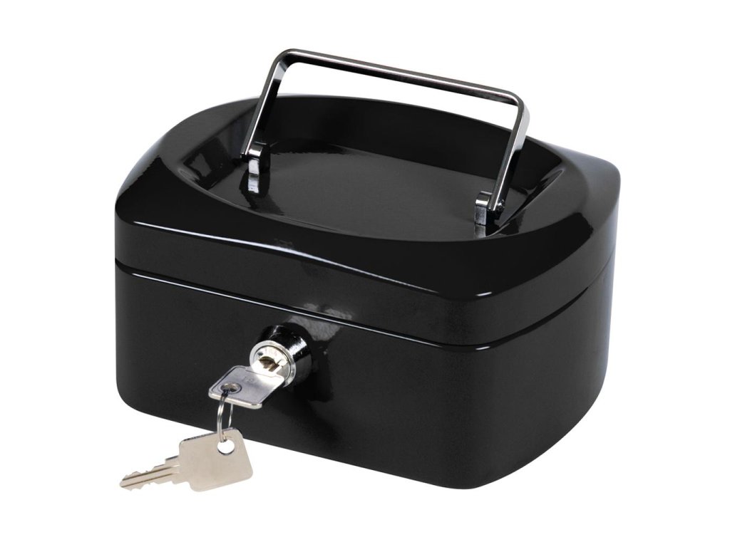 Uzamykateľná pokladnička s tvarovaným úchytom, plastovou priehradkou na mince a 2 kľúčami. Materiál pevná oceľ. Rozmery 155 × 75 × 120 mm. Farba čierna.