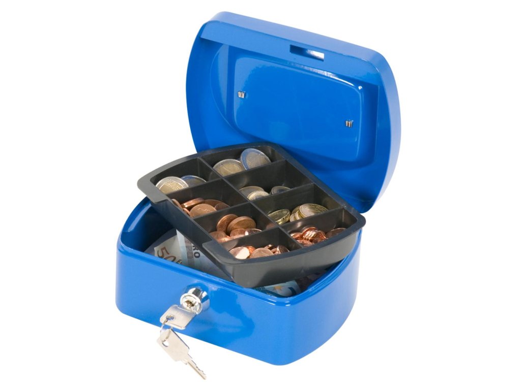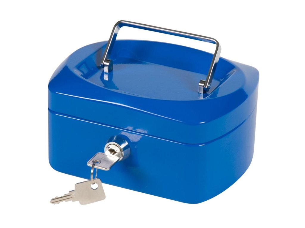 Uzamykateľná pokladnička s tvarovaným úchytom, plastovou priehradkou na mince a 2 kľúčami. Materiál pevná oceľ. Rozmery 155 × 75 × 120 mm. Farba modrá.