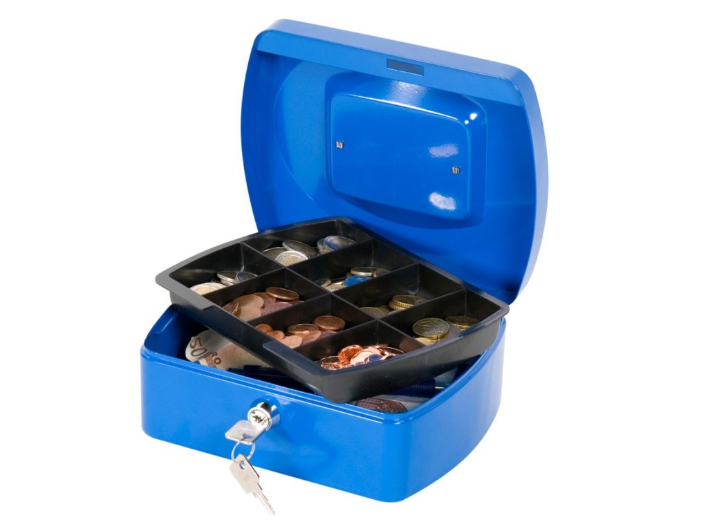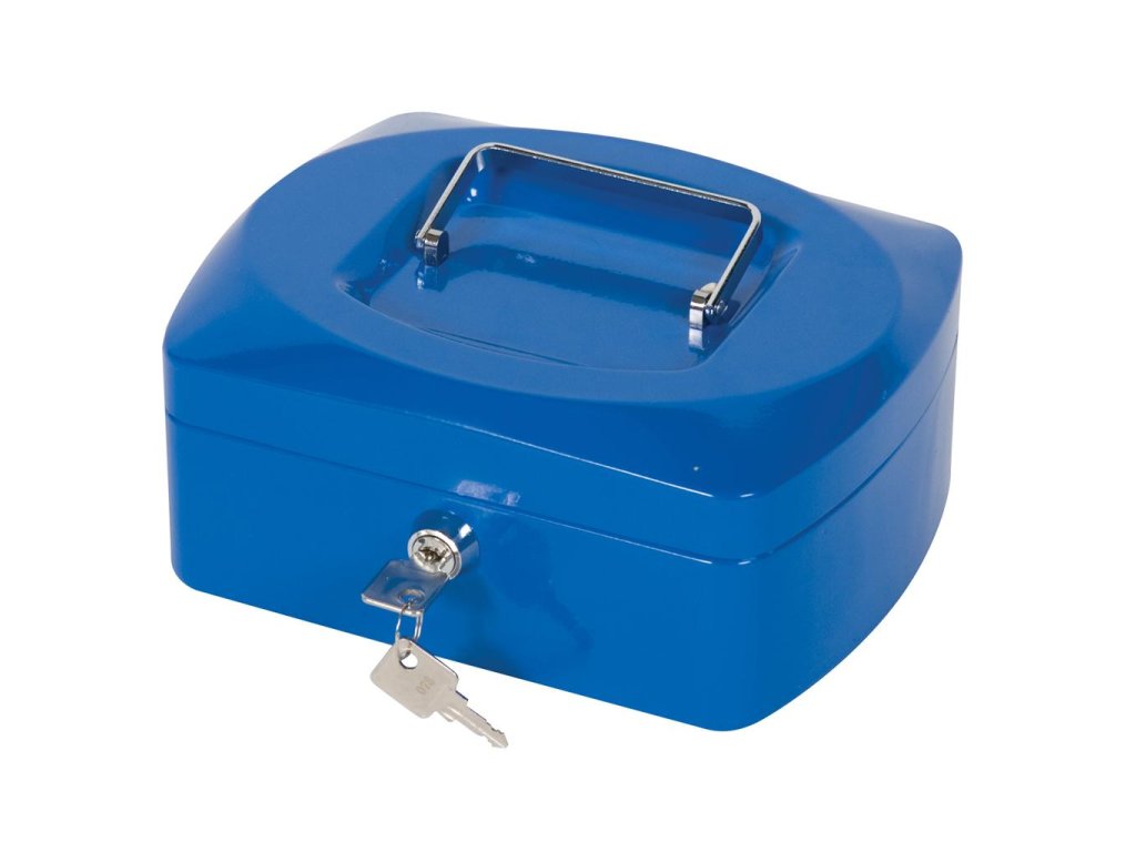 Uzamykateľná pokladnička s tvarovaným úchytom, plastovou priehradkou na mince a 2 kľúčami. Materiál pevná oceľ. Rozmery 205 × 85 × 160 mm. Farba modrá.