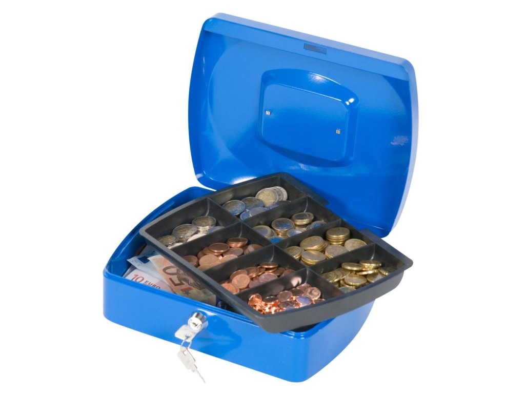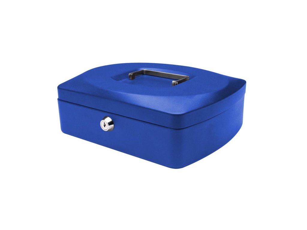Uzamykateľná pokladnička s tvarovaným úchytom, plastovou priehradkou na mince a 2 kľúčami. Materiál pevná oceľ. Rozmery