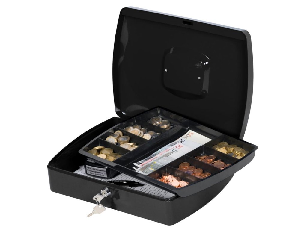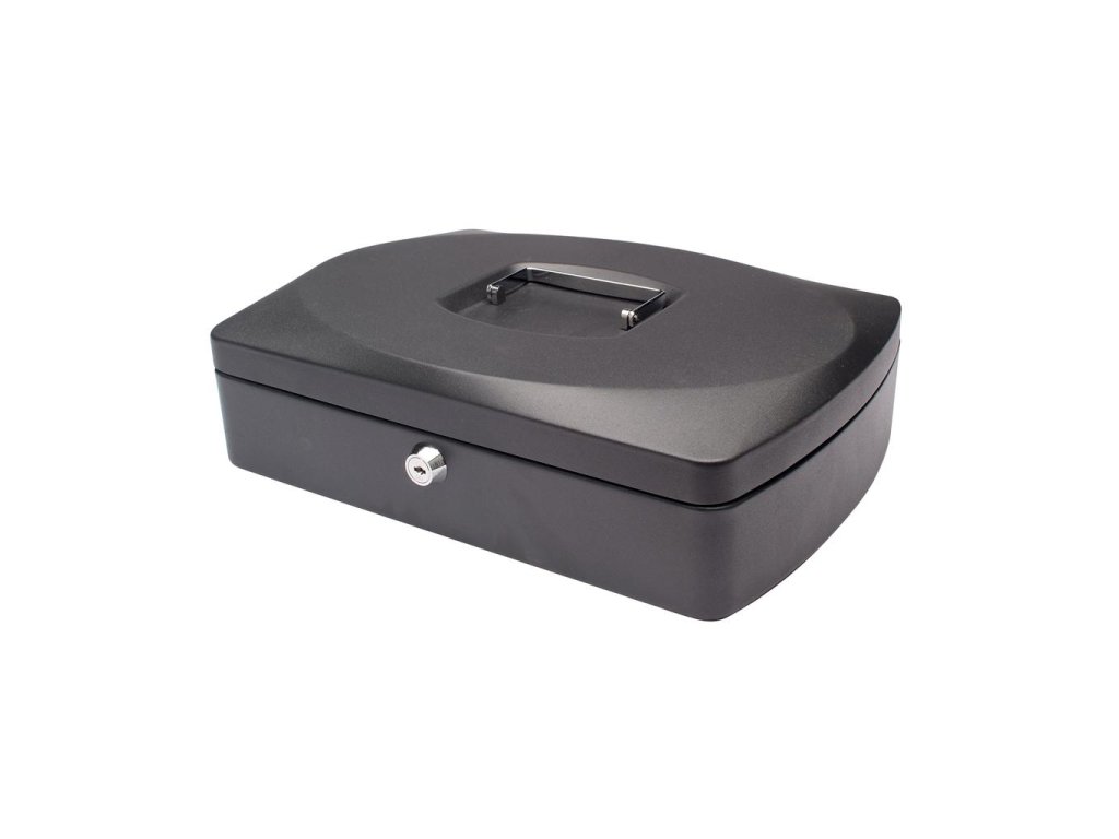 Uzamykateľná pokladnička s tvarovaným úchytom, plastovou priehradkou na mince a 2 kľúčami. Materiál pevná oceľ. Rozmery