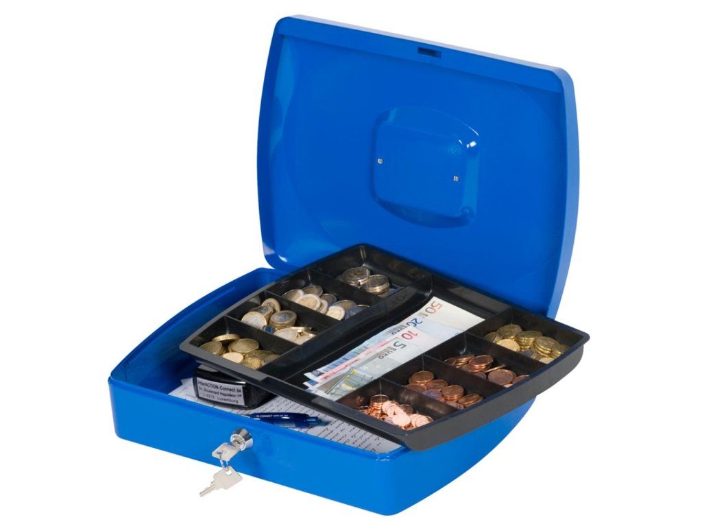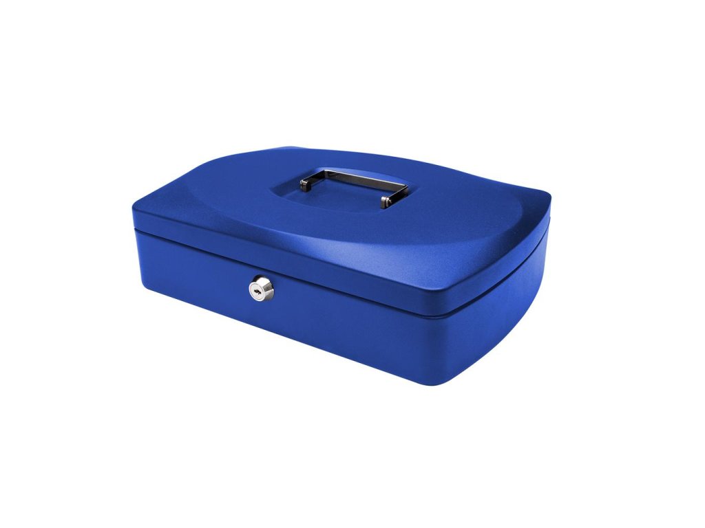 Uzamykateľná pokladnička s tvarovaným úchytom, plastovou priehradkou na mince a 2 kľúčami. Materiál pevná oceľ. Rozmery
