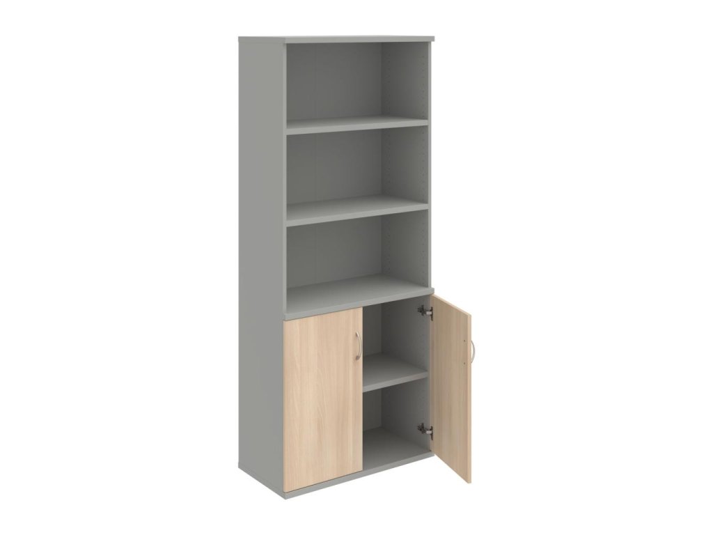 Kombinovaná skriňa - dvere/nika. Kancelárske skrine STRONG majú robustnú konštrukciu a vyššiu nosnosť políc ako bežné kancelárske skrine.V ponuke sú skriňové moduly s výškou 185 cm, 111 cm alebo 74 cm a šírky 80 cm alebo 40 cm.Hĺbka všetkých modelov skriňového radu STRONG je 40 cm.Chrbát, vyrobený z 8 mm hrubých dosák, je obojstranne pohľadový, takže skrine môžete použiť ako priestorový deliaci prvok. Hrúbka samotných políc je 25 mm, čo znamená nosnosť 80 kg na 1 policu.Korpusy, dvierka a police skríň sú olepené odolnou 2mm ABS hranou, ktorá garantuje dostatočnú ochranu proti poškodeniu.