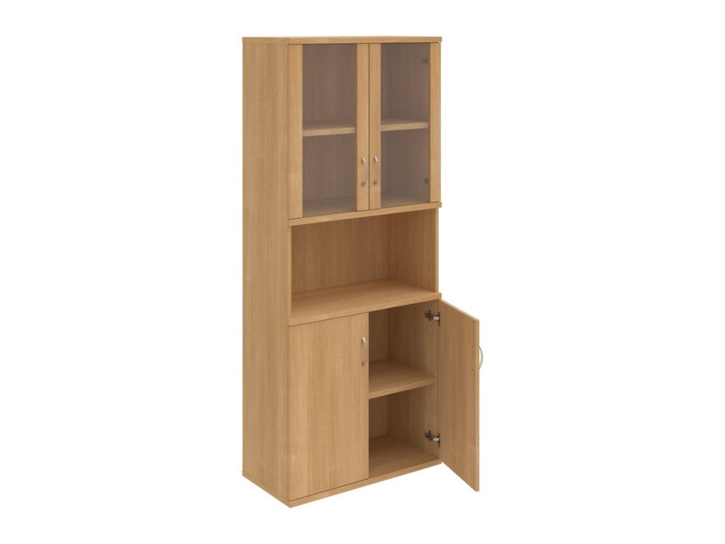 Kombinovaná skriňa - dvere/nika. Kancelárske skrine STRONG majú robustnú konštrukciu a vyššiu nosnosť políc ako bežné kancelárske skrine.V ponuke sú skriňové moduly s výškou 185 cm, 111 cm alebo 74 cm a šírky 80 cm alebo 40 cm. Hĺbka všetkých modelov skriňového radu STRONG je 40 cm.Chrbát, vyrobený z 8 mm hrubých dosák, je obojstranne pohľadový, takže skrine môžete použiť ako priestorový deliaci prvok. Hrúbka samotných políc je 25 mm, čo znamená nosnosť 80 kg na 1 policu.Korpusy, dvierka a police skríň sú olepené odolnou 2mm ABS hranou, ktorá garantuje dostatočnú ochranu proti poškodeniu.