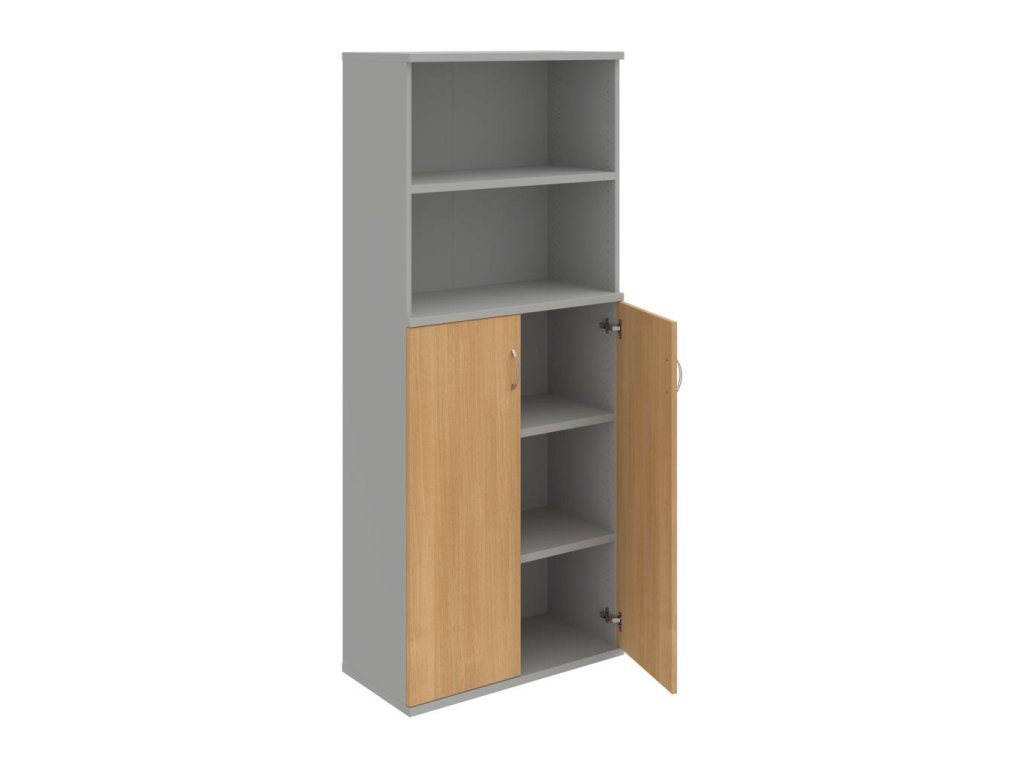 Kombinovaná skriňa - dvere/nika. Kancelárske skrine STRONG majú robustnú konštrukciu a vyššiu nosnosť políc ako bežné kancelárske skrine.V ponuke sú skriňové moduly s výškou 185 cm, 111 cm alebo 74 cm a šírky 80 cm alebo 40 cm.Hĺbka všetkých modelov skriňového radu STRONG je 40 cm.Chrbát, vyrobený z 8 mm hrubých dosák, je obojstranne pohľadový, takže skrine môžete použiť ako priestorový deliaci prvok. Hrúbka samotných políc je 25 mm, čo znamená nosnosť 80 kg na 1 policu.Korpusy, dvierka a police skríň sú olepené odolnou 2mm ABS hranou, ktorá garantuje dostatočnú ochranu proti poškodeniu.