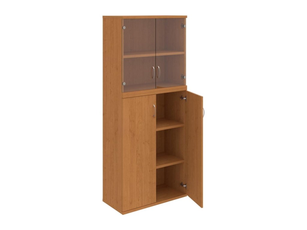 Kombinovaná skriňa - dvere/nika. Kancelárske skrine STRONG majú robustnú konštrukciu a vyššiu nosnosť políc ako bežné kancelárske skrine.V ponuke sú skriňové moduly s výškou 185 cm, 111 cm alebo 74 cm a šírky 80 cm alebo 40 cm. Hĺbka všetkých modelov skriňového radu STRONG je 40 cm.Chrbát, vyrobený z 8 mm hrubých dosák, je obojstranne pohľadový, takže skrine môžete použiť ako priestorový deliaci prvok. Hrúbka samotných políc je 25 mm, čo znamená nosnosť 80 kg na 1 policu.Korpusy, dvierka a police skríň sú olepené odolnou 2mm ABS hranou, ktorá garantuje dostatočnú ochranu proti poškodeniu.