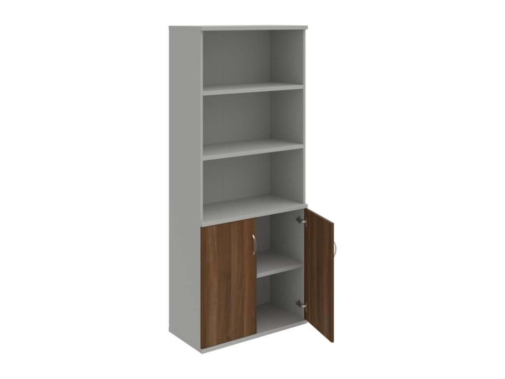Kombinovaná skriňa - dvere/nika. Kancelárske skrine STRONG majú robustnú konštrukciu a vyššiu nosnosť políc ako bežné kancelárske skrine.V ponuke sú skriňové moduly s výškou 185 cm, 111 cm alebo 74 cm a šírky 80 cm alebo 40 cm.Hĺbka všetkých modelov skriňového radu STRONG je 40 cm.Chrbát, vyrobený z 8 mm hrubých dosák, je obojstranne pohľadový, takže skrine môžete použiť ako priestorový deliaci prvok. Hrúbka samotných políc je 25 mm, čo znamená nosnosť 80 kg na 1 policu.Korpusy, dvierka a police skríň sú olepené odolnou 2mm ABS hranou, ktorá garantuje dostatočnú ochranu proti poškodeniu.