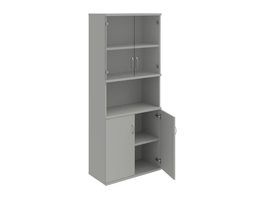 Kombinovaná skriňa - dvere/nika. Kancelárske skrine STRONG majú robustnú konštrukciu a vyššiu nosnosť políc ako bežné kancelárske skrine.V ponuke sú skriňové moduly s výškou 185 cm, 111 cm alebo 74 cm a šírky 80 cm alebo 40 cm. Hĺbka všetkých modelov skriňového radu STRONG je 40 cm.Chrbát, vyrobený z 8 mm hrubých dosák, je obojstranne pohľadový, takže skrine môžete použiť ako priestorový deliaci prvok. Hrúbka samotných políc je 25 mm, čo znamená nosnosť 80 kg na 1 policu.Korpusy, dvierka a police skríň sú olepené odolnou 2mm ABS hranou, ktorá garantuje dostatočnú ochranu proti poškodeniu.