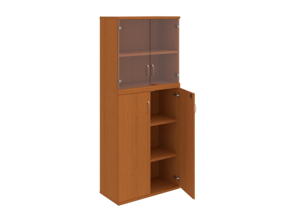 Kombinovaná skriňa - dvere/nika. Kancelárske skrine STRONG majú robustnú konštrukciu a vyššiu nosnosť políc ako bežné kancelárske skrine.V ponuke sú skriňové moduly s výškou 185 cm, 111 cm alebo 74 cm a šírky 80 cm alebo 40 cm. Hĺbka všetkých modelov skriňového radu STRONG je 40 cm.Chrbát, vyrobený z 8 mm hrubých dosák, je obojstranne pohľadový, takže skrine môžete použiť ako priestorový deliaci prvok. Hrúbka samotných políc je 25 mm, čo znamená nosnosť 80 kg na 1 policu.Korpusy, dvierka a police skríň sú olepené odolnou 2mm ABS hranou, ktorá garantuje dostatočnú ochranu proti poškodeniu.