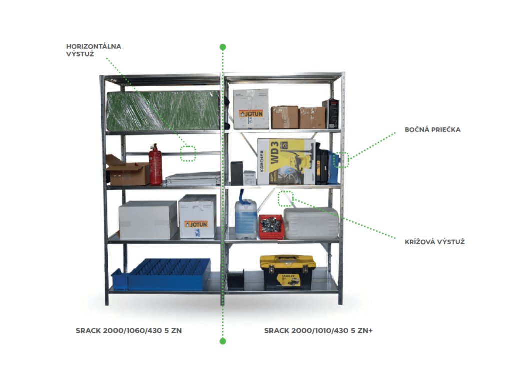 SRACK 2000/1060/430 5 ZN je univerzálny policový regál. Ak potrebujete viacmodulový regál, pridajte do košíka aj prídavný modul SRACK 2000/1010/430 5 ZN+ v požadovanom množstve.