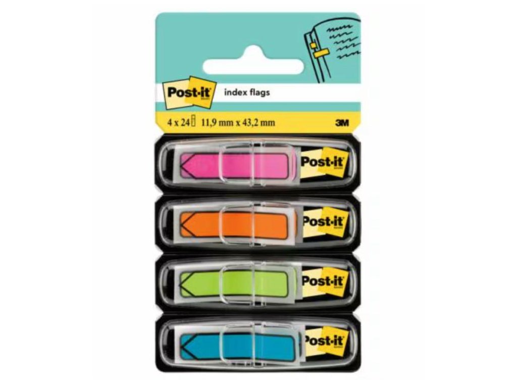 Úzke acetátové záložky do kníh, časopisov, ako register do cenníkov, kartoték, katalógov, zakladačov, archívov a pod. Priehľadná lepiaca čast a farebná časť na označenie.Prelepiteľné, znovunalepiteľné a popisovateľné. Rozmery záložky 11,9 x 43,1 mm. Dodávané v kombinácii 4 základných (červená,oranžová, modrá, žltá) alebo 4 neónových farieb )žltá, fialová, ružová. modrá) po 24 lístkov.Záložky s potlačou šípky upozorňujú na konkrétnu informáciu v texte. Šírka indexu 11,9 mm, v balení 4 farby po 24 lístkov.
