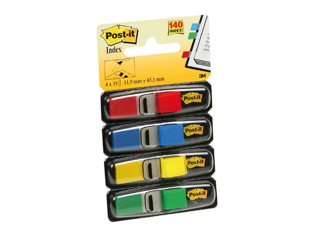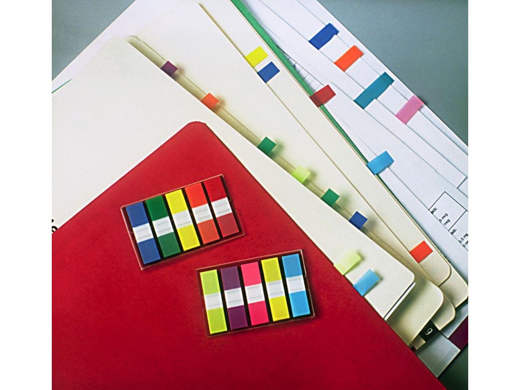 Úzke acetátové záložky do kníh, časopisov, pre register do cenníkov, katalógov, kartoték, zakladačov, archívov a pod. Priehľadná lepiaca časť a farebná časť pre označenie. Prelepiteľné, znovunalepiteľné a popisovateľné. Rozmery záložky 11,9 × 43,1 mm. Dodávaná v kombinácii 4 základných farieb (červená, modrá, zelená, žltá) po 35 lístkov.