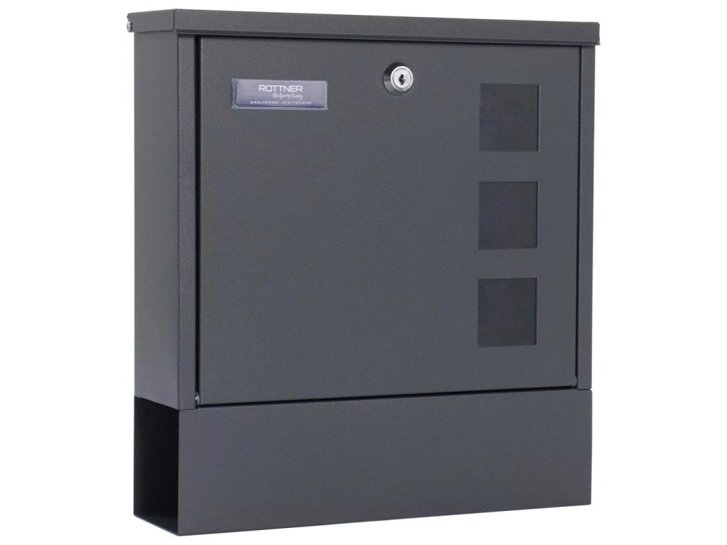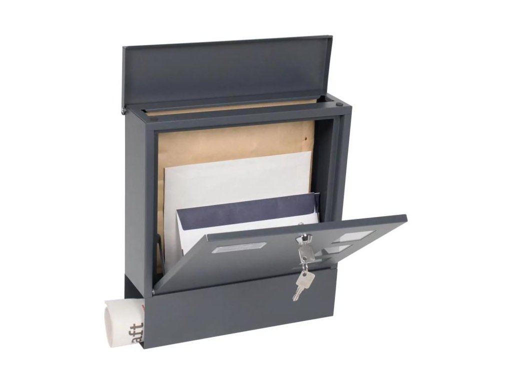 Antracitová poštová schránka Lago disponuje klasickým cylindrickým zámkom spolu s 2 kľúčmi. Poštová schránka disponuje horným vhodom pre poštu do veľkosti max. A4. Horný vhod je chránený krytkou, aby do vnútra schránky nevnikala dažďová voda a iné nečistoty. Na predných dverách je pripravené miesto na menovku. Okrem menovky sa na prednej strane nachádzajú aj 3 priehľadné okienka. Spodná strana disponuje samostatným boxom na noviny a dennú tlač. Zadná strana má pripravené otvory na upevnenie. Materiál na upevnenie je súčasťou balenia.