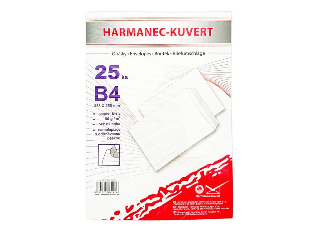 Obálky rozmeru 353 × 250 mm, vyrobené z bieleho bezdrevného papiera, otvor na kratšej strane, 90 g/ m2. Farba biela. Lepenie páskou.
