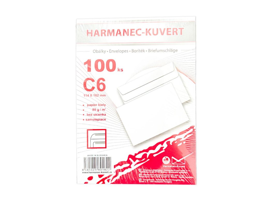 Biele obálky rozmeru 114 × 162 mm, vyrobené z bezdrevného papiera, 80 g/ m2. Samolepiace.