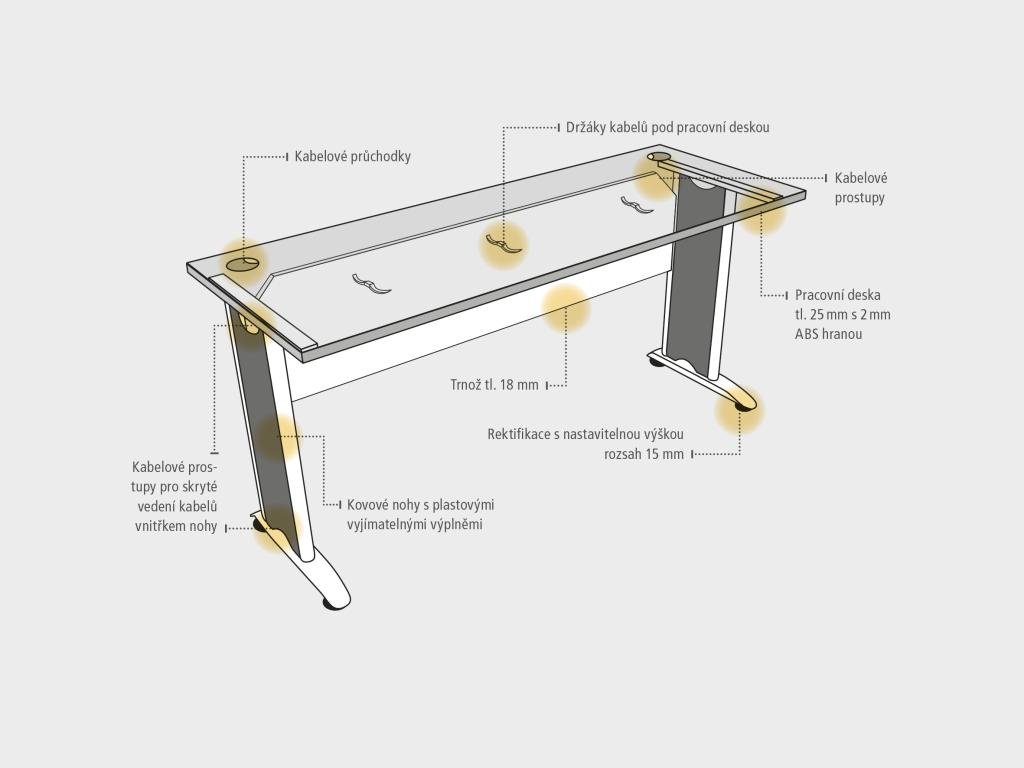 Samozrejmosťou je rektifikačný systém, ktorý v prípade nerovnej podlahy umožňuje výškové dorovnanie stola až o 1,5 cm. Nohy prepája 18mm hrubá laminovaná drevotriesková doska, ktorá zaisťuje stabilitu stola.