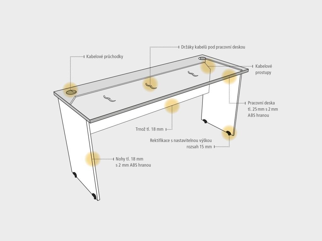 Nadčasový dizajn a užívateľská ústretovosť. Ergonomické tvary pre maximálne využitie pracovnej plochy. Vysoký stupeň súkromia - boky aj priečky z plných dosiek. Vysoká miera stability. Pracovná doska stola má hrúbku 25 mm a je vybavená 2mm ABS hranou, ktorá stoly pomáha chrániť pred poškodením. Dosky a priečky sú hrúbky 18 mm a ich odolnosť zaisťujú 2mm ABS hrany na vonkajšej aj vnútornej strane. Nohy sú osadené výškovo nastaviteľnou rektifikáciou, čo v prípade nerovnosti podlahy umožňuje dorovnať si stôl až o 1,5 cm. Stabilitu stola zaisťuje priečka, tzv. trnož, ktorá spája obe nohy stola. Trnož je vyrobená z plnej, 18 mm hrubej dosky. Široká škála kombinácií - 106 vzájomne kombinovateľných prvkov. Pre zabezpečenie čo najvyššieho komfortu sú v ponuke aj rohové pracovné stoly s ergonomicky tvarovanými doskami, ktoré zodpovedajú norme (STN EN 527-1). O káble od PC alebo stolovej lampy sa postará praktická priechodka, ktorá káble jednoducho zvedie pod dosku, kde si s nimi poradia múdro skonštruované držiaky. Konštrukcia stolov spĺňa vysoké nároky na kvalitu a ergonómiu (STN EN 527-1) a zodpovedá tak normám STN EN 527-2, STN EN 527-3, STN 910001 a STN 910100. Efektivitu dopravy do Vašej kancelárie zaisťujú dodávky jednotlivých dielov stola, ktoré sú bezpečne zabalené. Súčasťou každého balenia je tiež prehľadný návod. Na stoly GATE sa vzťahuje záruka 5 rokov.