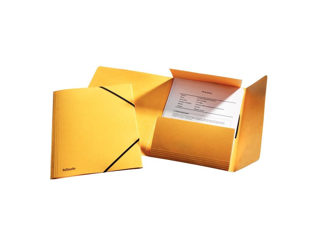 Obal A4 s tromi chlopňami a čiernou gumičkou. Materiál na dotyk príjemný prešpán. Prelisy na chlopniach a chrbte zvyšujú kapacitu obalu. Väčšie balenie 10 ks.
