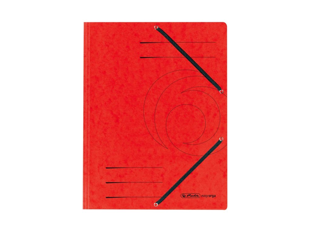 Obal A4 s tromi chlopňami a dvomi gumičkami čiernej farby. Materiál prešpánový kartón gramáže 355 g / m². Väčšie balenie 25 ks. Farba červená.