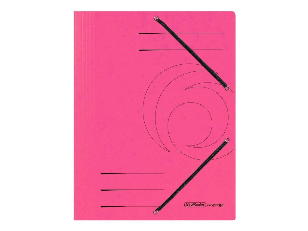 Obal A4 s tromi chlopňami a dvomi gumičkami čiernej farby. Materiál prešpánový kartón gramáže 355 g / m². Väčšie balenie 25 ks. Farba ružová.