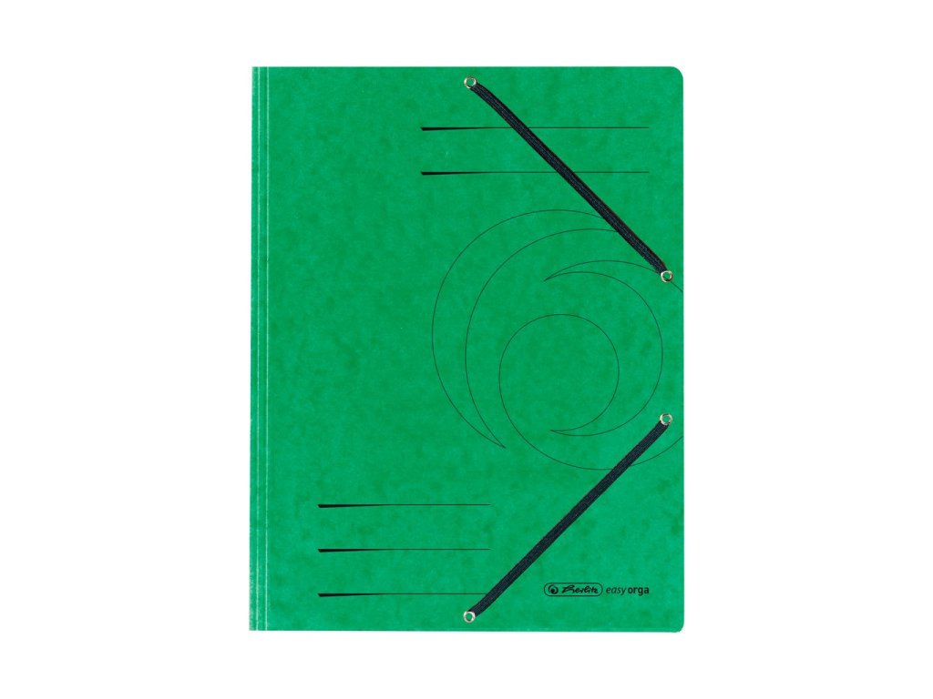 Obal A4 s tromi chlopňami a dvomi gumičkami čiernej farby. Materiál prešpánový kartón gramáže 355 g / m². Väčšie balenie 25 ks. Farba zelená.