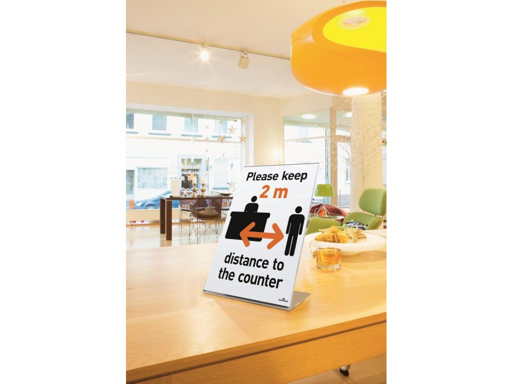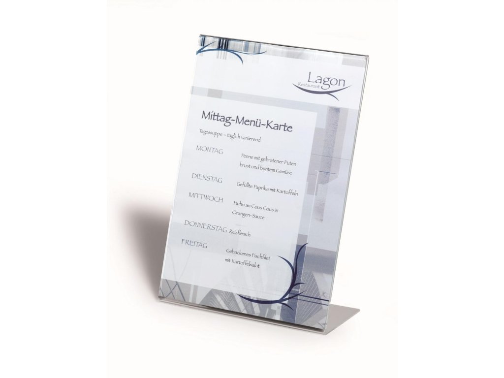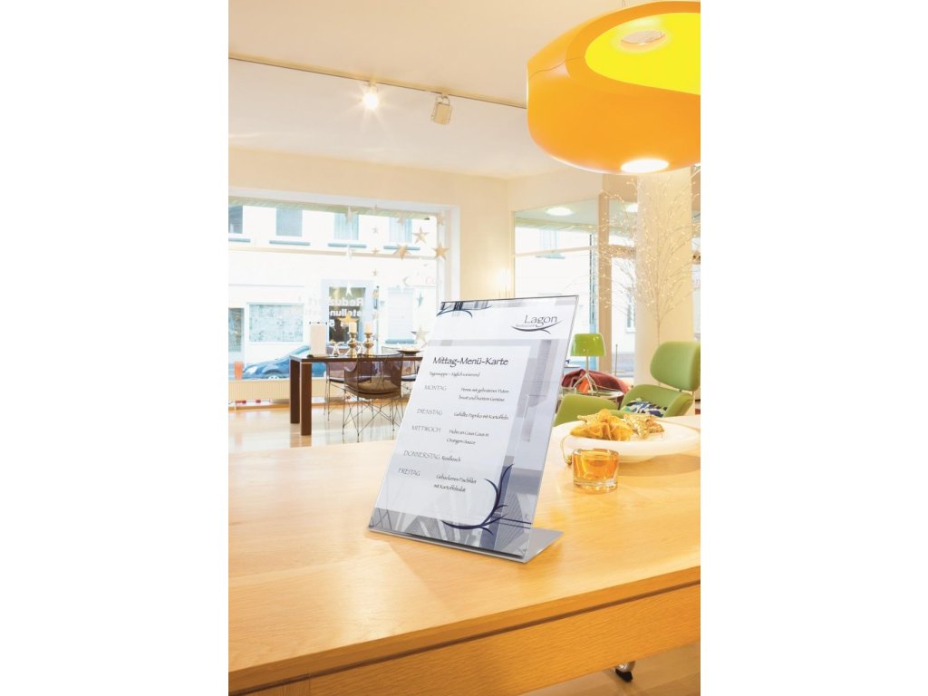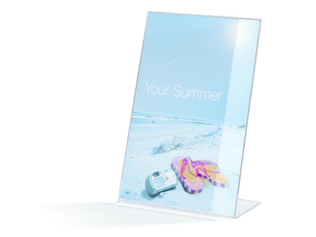 Stojan vhodný na prezentáciu ľubovoľných informácií. Vyrobený z kvalitného číreho akrylu. Samolepiace gumové podložky zabezpečujú dobrú stabilitu. Formát A4.