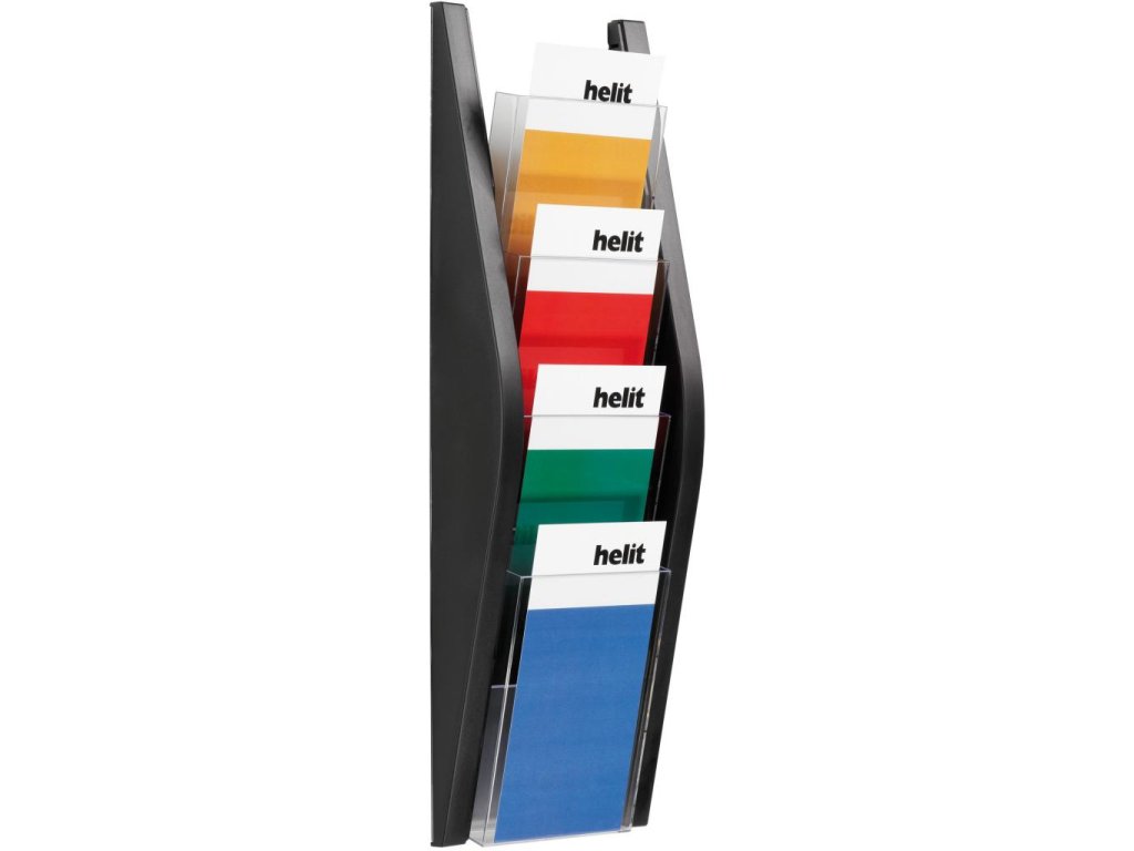 Nástenný stojan na prezentáciu materiálov. Štyri priehľadné priehradky slúžia na umiestnenie materiálov formátu 1/3 A4. Materiál kvalitný plast. Rozmery (š x v x h) 165 x 540 x 80 mm. Farba čierna.
