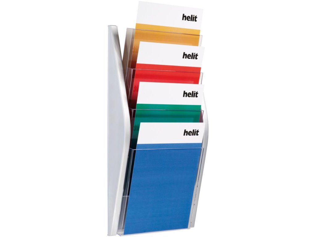 Nástenný stojan na prezentáciu materiálov. Štyri priehľadné priehradky slúžia na umiestnenie materiálov formátu A4. Materiál kvalitný plast. Rozmery (š x v x h) 275 x 540 x 80 mm. Farba strieborná.