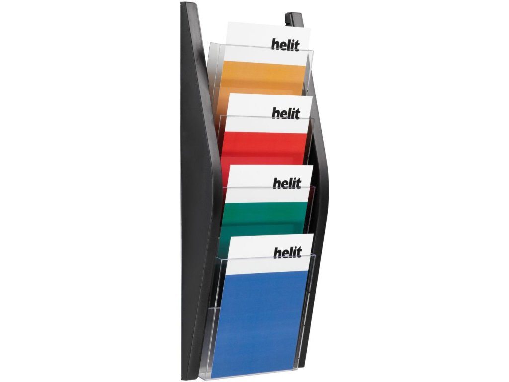 Nástenný stojan na prezentáciu materiálov. Štyri priehľadné priehradky slúžia na umiestnenie materiálov formátu A5. Materiál kvalitný plast. Rozmery (š x v x h) 215 x 540 x 80 mm. Farba čierna.