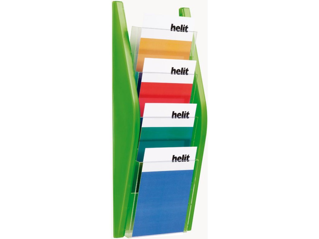 Nástenný stojan na prezentáciu materiálov. Štyri priehľadné priehradky slúžia na umiestnenie materiálov formátu A5. Materiál kvalitný plast. Rozmery (š x v x h) 215 x 540 x 80 mm. Farba zelená.