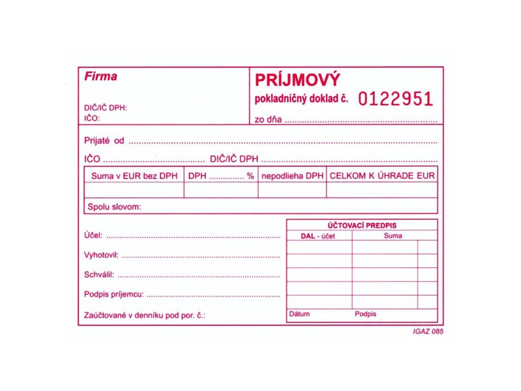 Príjmový pokladničný doklad s DPH, samoprepis. Blok formátu A6, 100 listov, číslovaný.