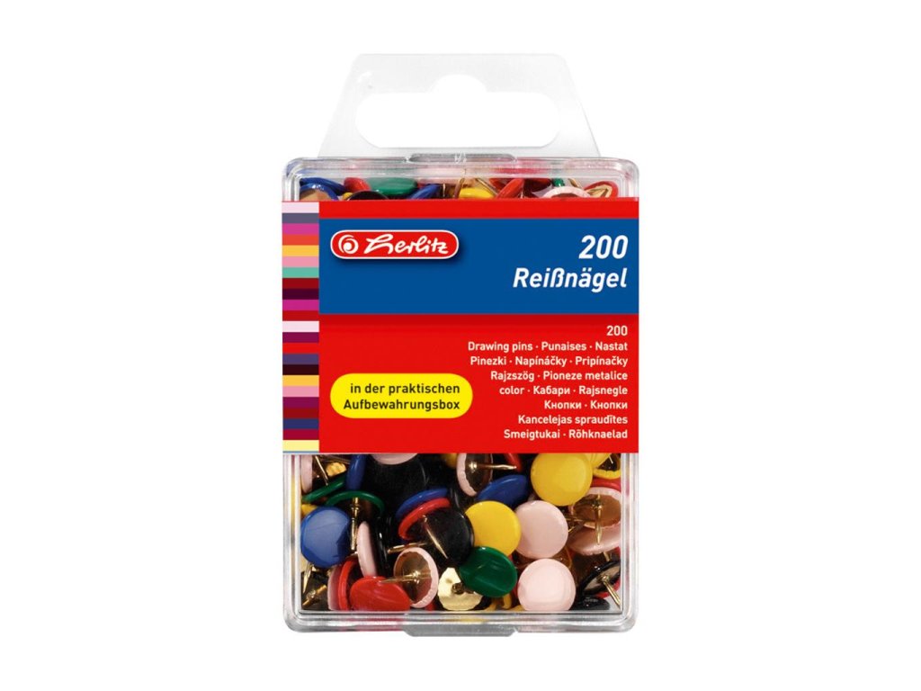 Farebné kovové pripínačky. Priemer hlavičky 9 mm. Balené v plastovej krabičke po 200 ks. Farba mix.